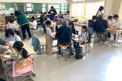 ものづくり教育プログラムを1・2年生の皆さんが受講しました。今日は、「コトコトくるま」と「牛乳パックダーツ」を作って体育館で遊びました。ゴムの特性をうまく使い「ゴムで動くおもちゃ」づくりをサポーターの皆さんと一緒に行いました。おもちゃを作りながらゴムの性質を上手に利用することを楽しく学びました。