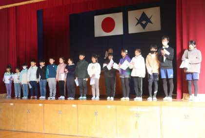 2時間目に冬休み前集会を行いました。いつも通り中金っ子の皆さんは静かに入場することができました。1番早く来たのは6年生。続いて1年生。早く来たクラスが静かに待てるため、後から来るクラスも静かに入ってきます。今日は、中金賞の表彰と冬休みの生徒指導と健康について注意してほしいことを2人の先生から聞きました。「こども110番の家」について、登下校時だけでなくいつでも頼っていいんだよ。「中金小の○○です」と言えば、いつでも助けてもらえるよ。という話もありました。