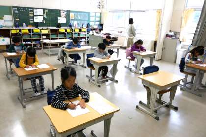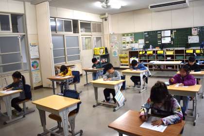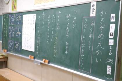 1月7日(火)、書き初め大会が行われました。書き初めは、抱負や希望、縁起のいい言葉など、一年の始まりにふさわしい言葉を、その年の恵方(西南西)に向いて書くという日本古来の正月行事です。今年の書き初め大会も、どこの学級も落ち着いたいい緊張感が感じられ、いい作品がたくさん出来上がりました。いいスタートが切れました。
