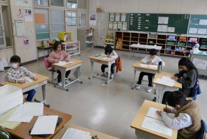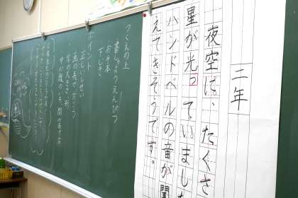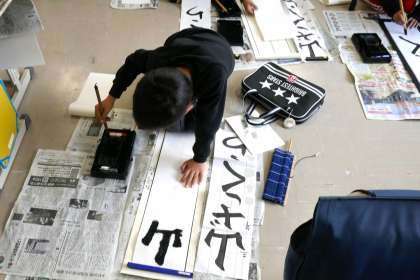 1月7日(火)、書き初め大会が行われました。書き初めは、抱負や希望、縁起のいい言葉など、一年の始まりにふさわしい言葉を、その年の恵方(西南西)に向いて書くという日本古来の正月行事です。今年の書き初め大会も、どこの学級も落ち着いたいい緊張感が感じられ、いい作品がたくさん出来上がりました。いいスタートが切れました。