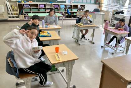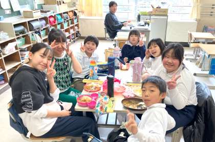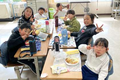 5、6年のお兄さんお姉さんが家庭科の授業の一環でカレーライスを作り後輩にふるまってくれました。登校時から「今日はカレー」と言って横断歩道を渡っていく中金っ子もいるくらい、みんなが楽しみにしている「中金カレーランチの日」。南山班で楽しくカレーライスを食べている雰囲気もとてもよかったです。とてもおいしいカレーライスでした。