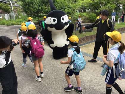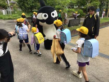 5月19日(月)の下校時に「グランパス君」が中金小学校にやってきました。「あ」は明るく、「い」はいつも自分から、「さ」は最高の笑顔を、「つ」は続ける、と「あいさつ」のことばに合わせて4つのキーワードを教えていただきました。どの子も「グランパス君」に最高の笑顔で、元気よく下校のあいさつができました。