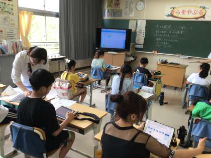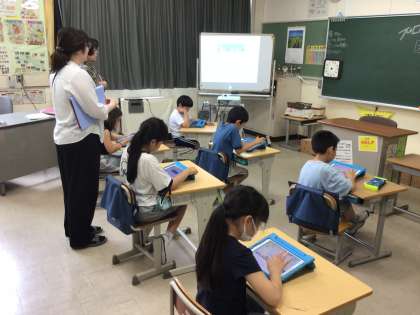 5月22日(木)、今日はICT支援員の松村さんが来校してくださいました。各学年の教室に入り込み、担任の先生と一緒にICT支援学習を行いました。スクラッチジュニアというアプリを使って、プログラミングを学んだり、スカイメニューの発表ノートを使ってプレゼンテーションの資料を作成したりしました。どの児童もタブレット学習は大好きです。教員以上にICTを使いこなせる児童もいて驚くほどです。松村さんには後3回、来校していただく予定です。児童はもちろん教職員もICTスキルを松村さんから学ぶことで、スキルを向上させていっています。