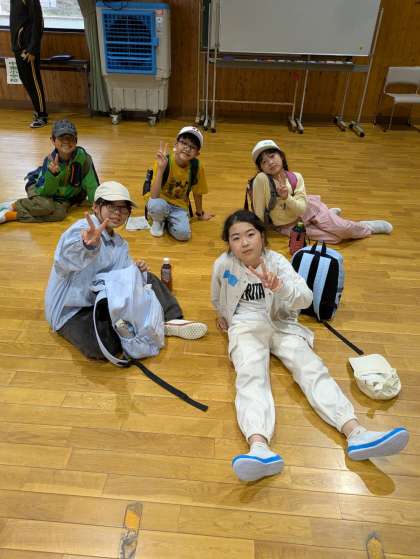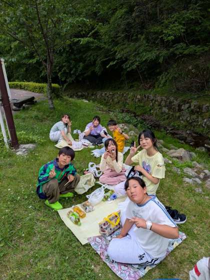 待ちに待ったお弁当タイム。天気も何とかもっていて、屋外のつどいの広場で班ごとに食べました。ゲーム大会を通じて、他の小学校のお友達とも少しずつおしゃべりができるようになりました。おいしいお弁当に舌鼓をうって、みんな完食です。