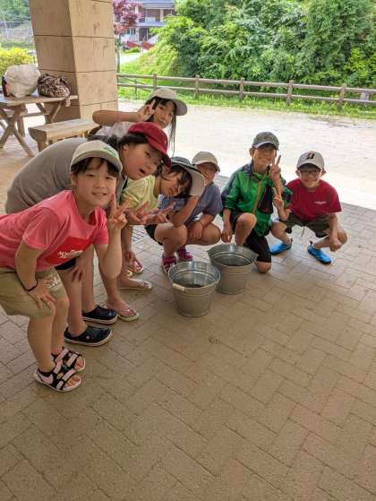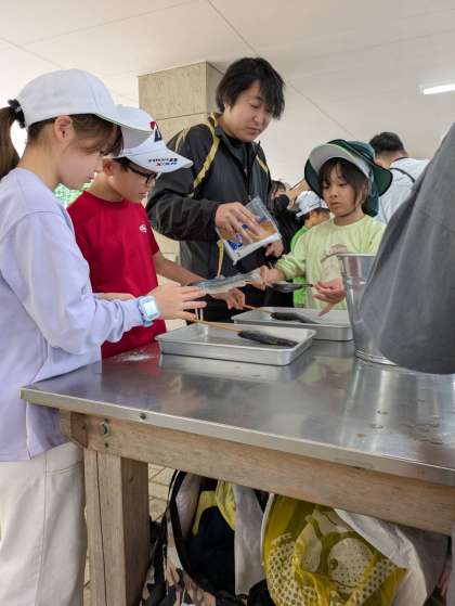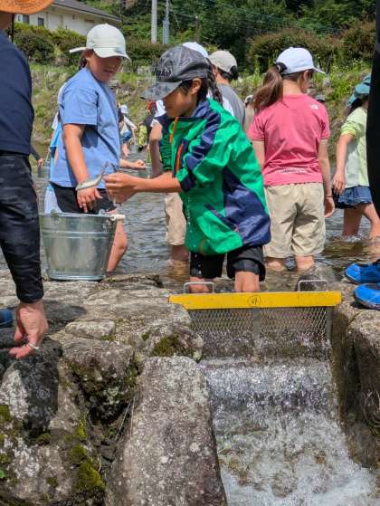 今日の魚はイワナ。とても元気よく泳いでいたイワナですが、みんな上手に捕まえることができました。なんと、中金小学校の児童が一番最初に捕まえ、他の学校の分も捕まえてあげていました。串刺しも、塩での味付けも自分たちでやりました。食べるのが楽しみです。