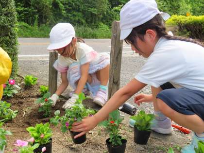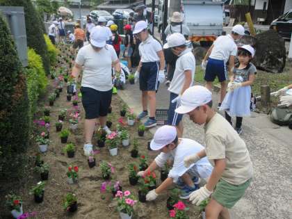 6月4日(水)に春の植栽活動を全校児童参加で行いました。この活動は国道153号線を利用する方々の交通安全を願って、側道にたくさんの花の苗を植えます。(株)鈴鍵の加藤さんに教えていただきながら、南山班ごとに協力し合って色とりどりの花の苗を植えました。子どもたちが植えた花が、ドライバーの心や気持ちを癒し、交通事故がなくなることを願ってやみません。