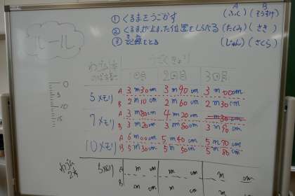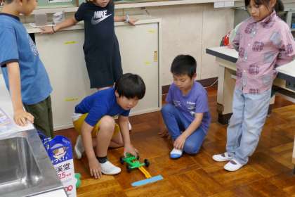 次の授業では、輪ゴムの伸ばす長さや本数を変えながら、車が進む距離との関係を観察しました。どこに注目して観察するかを意識しながら記録を取り、その結果から「どうしたらぴったり止まるのか?」を考察することで、理科の学びにおいて大切な「実験」「記録」「考察」の力を体験的に身につけています。