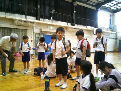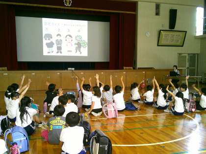 本日、2〜5年生を対象に「子どもの防犯教室」を開催しました。講師として、豊田市交通安全防犯課より地域安全指導員4名の方々をお招きし、子どもたちにとって大切な防犯の知識と技術を教えていただきました。