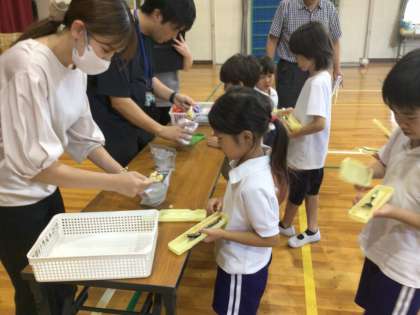 避難訓練の後は、防災食の体験も行いました。お湯ではなく、水だけを入れて作る非常食を全員で実食し、「おいしい」「固くない」「ちょっと冷たい」「これなら非常時にも食べられそう」といった感想が聞かれました。