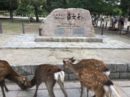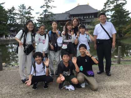 昼食後、奈良公園、東大寺へ来ました。奈良の大仏の大きさにみんなびっくり。修学旅行生や外国からの観光客の多さにもびっくりです。みんなで大仏殿を見学した後は、お楽しみの班別自由行動です。鹿に上手におせんべいをあげることができるかな?