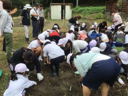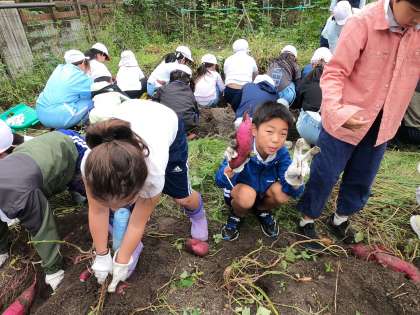 全校児童が南山班ごとに分かれて芋掘りを行いました。5月に植えたさつまいもの苗は、夏の太陽をたっぷり浴びて大きく育ち、土の中でしっかりと根を張っていました。