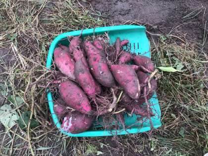 子どもたちは「どこにあるかな?」「大きいのが出てきた!」と歓声を上げながら、力いっぱい土を掘り、たくさんのさつまいもを収穫しました。収穫した芋はしばらく寝かせて甘みを引き出し、11月の収穫祭で美味しくいただく予定です。