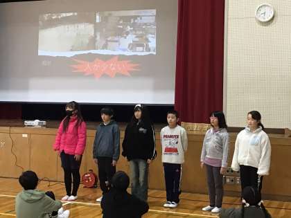 保健体育委員会からは、外で元気に遊ぶことを推奨するために新しく購入した竹馬と一輪車練習台の紹介がありました。これらの遊具は、委員会の児童が「どんな遊具なら外遊びがもっと楽しくなるか」を話し合い、現状を分析したうえで選んだものです。新しい遊具は、1月21日(水)のフレンドタイムから使用できます。