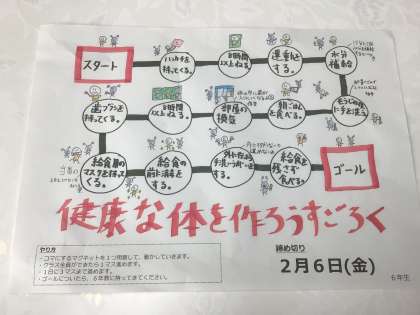 給食主任の先生からは感染症予防のための給食の配膳方法について改めて確認がありました。子どもたちは真剣に話を聞き、日々の生活で気をつけるべき点を再確認していました。それに加えて、6年生は保健の授業で学んだことをもとした「健康な体をつくろうすごろく」を作成し、全学年に向けて取り組みを呼びかけました。楽しみながら感染症予防について学べる工夫が込められています。