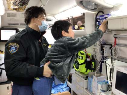 1月14日(水)、3年生が力石出張所を訪れ、消防や救急のお仕事についてお話を伺いました。実際に救急車に乗せていただき、車内の機器について説明を聞いたほか、消防の放水体験もさせていただきました。普段は見ることのできない現場の様子に触れ、子どもたちにとって大変貴重な学びの時間となりました。