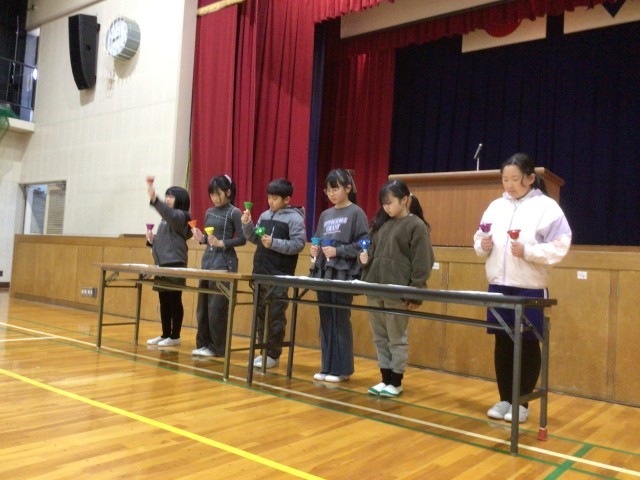 書初めや読書感想画など、各種表彰伝達の後には、音楽クラブがハンドベルで「夢をかなえてドラえもん」を演奏し、美しい音色が体育館に響き渡りました。
