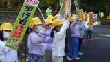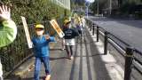 中金日影の交差点で、交通安全の呼びかけです。大きな声が出せないので、サインボー...