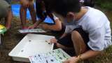 捕まえた水生生物を観察し、指標となる生き物がいくついるかを紙に記録します。その...