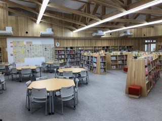 広い図書室は、木の温かい雰囲気をしています。読書が好きな子どもたちを育てていきます。