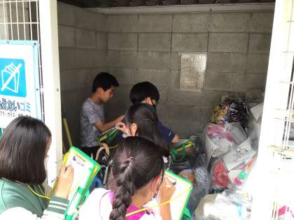 学校のごみ倉庫を見学し、どんなごみがどのくらい出されているのか調べました。