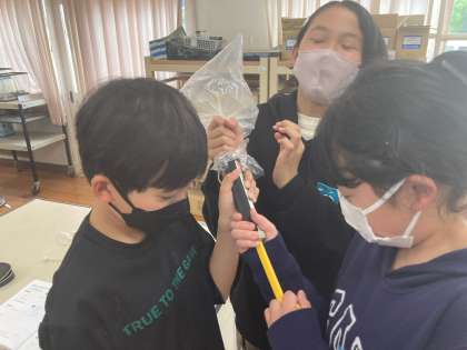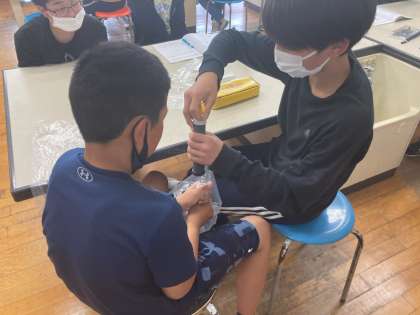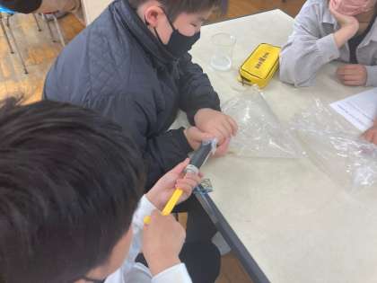 6年理科 体のつくりやはたらき 公開日 2023/04/19 更新日 2023/04/19 各学年から 6年生では「気体検知管」や「石灰水」など、物質を判断するものを扱います。 今日はそれらを使って、息に含まれる二酸化炭素について調べました。