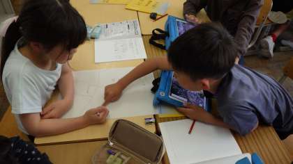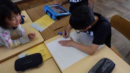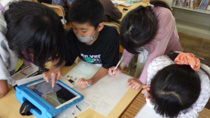 中山地区の地図作りをしました。タブレットを使って場所を確認しながら、地図に書いています。