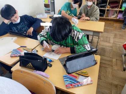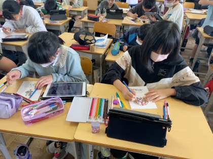 振り返りカードの表紙に絵を描きました。タブレットを活用して、上手に描くことができました。