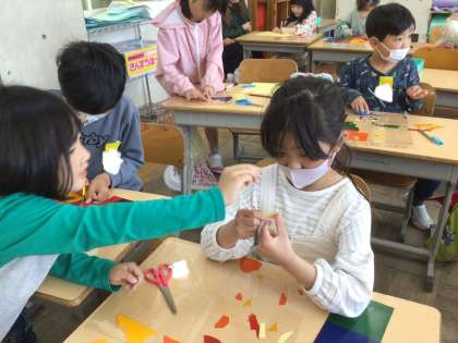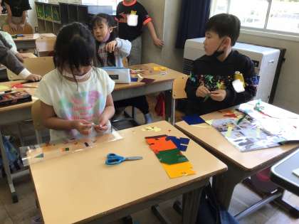 透明の色付きのシールを貼って太陽の下でキラキラさせて楽しみました。