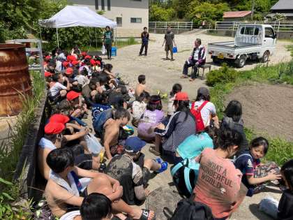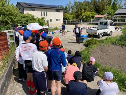 ・泥田遊びが終わった後の学校で泥落としの補助