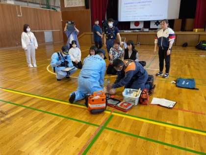 職員による消防署と連携をした救急救命講習が行われました。心肺蘇生法について学んだ後、シミュレーション研修として、アレルギーによるアナフィラキシー対応と、遊具から落ちてしまった児童を想定した実習を行いました。