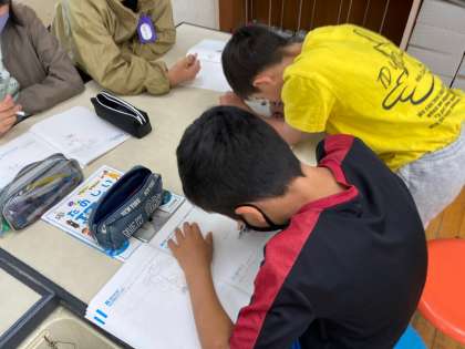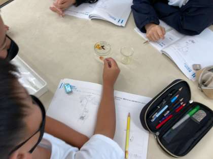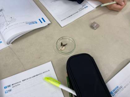 種子の中に含まれるデンプンを、ヨウ素液を使って確かめました。