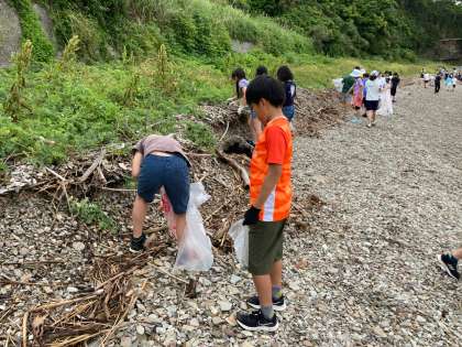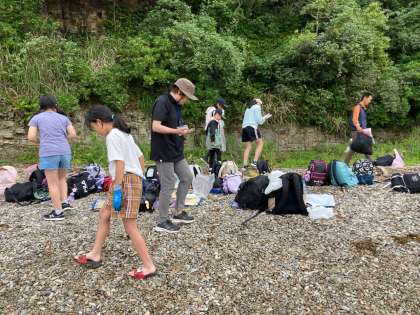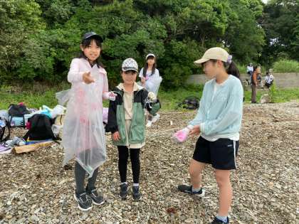願い石を拾った後、ゴミ拾いの活動をしています。