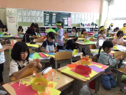図工で「わっかでへんしん」をしました。自分なりに考えて作りました。