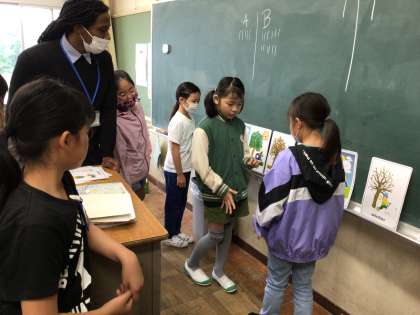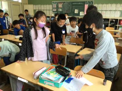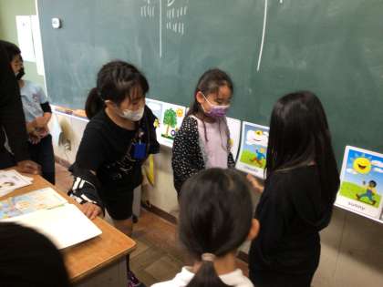 2チームに分かれて、天気や季節を表す英語を発音するゲームをしました。
