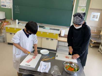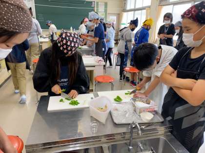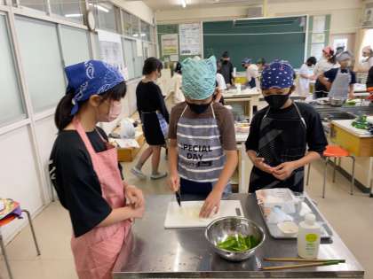 6年 家庭科 調理実習3 公開日 2023/05/29 更新日 2023/05/29 各学年から 1組では調理実習で野菜炒めを作りました。班で協力して準備から片付けまで行いました。お手伝いに来てくださったNファミの方々、今日もありがとうございました。