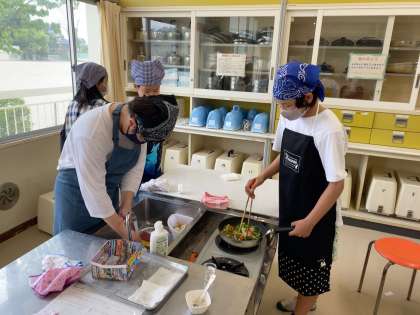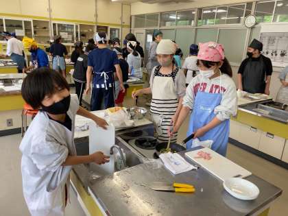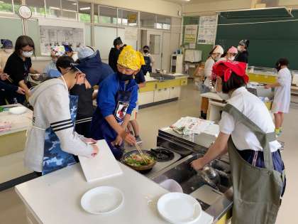 6年 家庭科 調理実習5 公開日 2023/05/29 更新日 2023/05/29 各学年から 1組では調理実習で野菜炒めを作りました。班で協力して準備から片付けまで行いました。お手伝いに来てくださったNファミの方々、今日もありがとうございました。