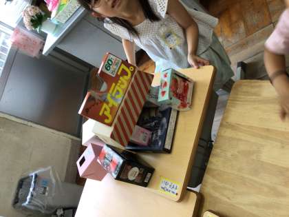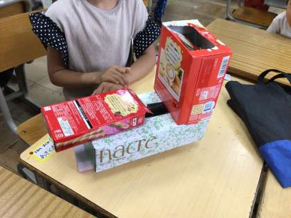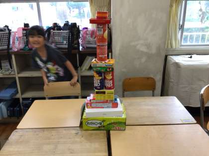 算数「いろいろなかたち」で、お店や東京タワー、犬など箱の形から工夫して様々なものを作りました。