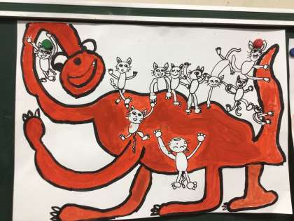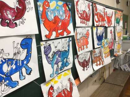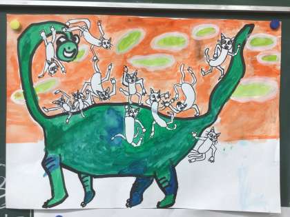 「恐竜とねこの散歩」 楽しい読書感想画に取り組んでいます。