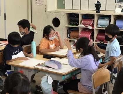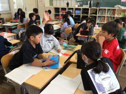 4年生 国語その3 公開日 2023/06/06 更新日 2023/06/06 各学年から 低学年に紹介する本を選び、グループで練習しました。低学年に合っている本かどうかや、分かりやすいかどうかを質問し合い、確認しました。