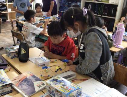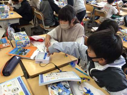 電池の向きを変えると電流の向きが変わるかどうか、簡易検流計を使って調べました。
