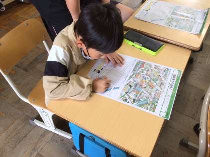 7・8・9・10組 地図を作ってみよう!(3年生 社会) 公開日 2023/06/08 更新日 2023/06/08 各学年から 3年生の社会科では 地図記号について学習しています。 この日の授業では 学習した地図記号を使って ワークシートにかかれた街のイラストを 地図にする練習をしました。