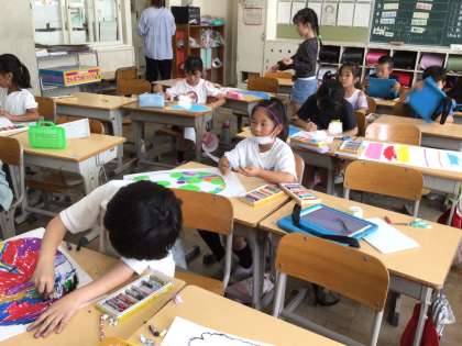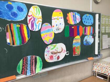 図工で「ふしぎなたまご」の殻を描きました。個性豊かなたまごができました。