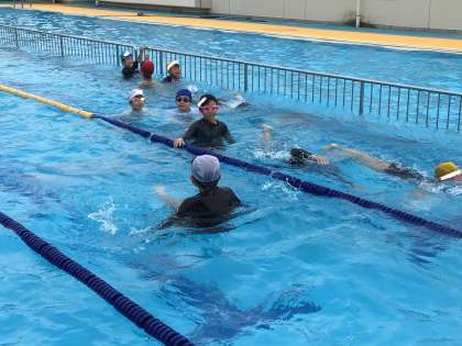 手でかきながら水中でジャンプし、もぐる練習をしました。