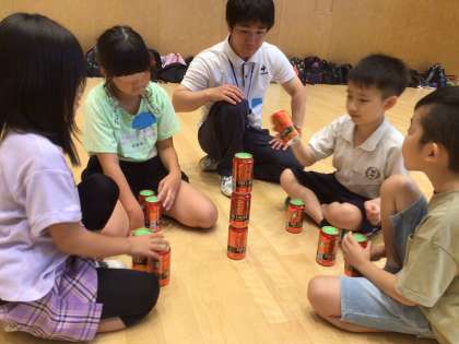 「御作小のSくん、飯野小のTくんと7組のHくんとぼくで、空き缶積みゲームをしました。4人で力を合わせて12個まで積めました。うれしかったです。」(4年生)
