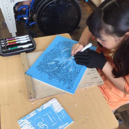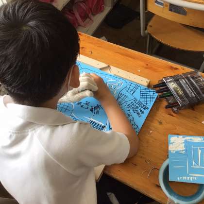 7・8・9・10組 いよいよ原板作りー4年生図工ー 公開日 2023/07/03 更新日 2023/07/03 各学年から 4年生の図工は いよいよ彫刻刀を使って 木版画の原板作りに入りました。 彫刻刀の使い方の学習で学んだ 正しい持ち方や掘り進め方を思い出しながら 下絵の線に沿って掘っていきます。 この日はまず下絵の輪郭を三角刀で掘り進めました。?