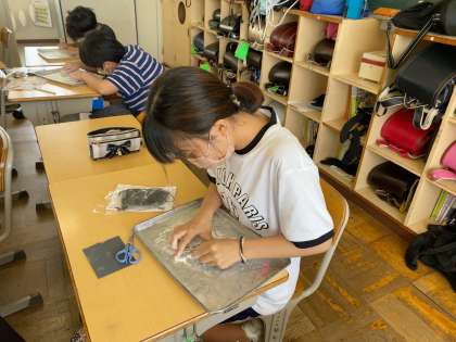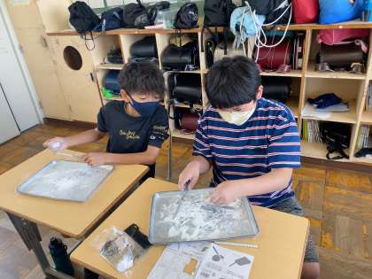 一生懸命に石を削ってまが玉を作っています。