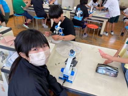 葉の裏側に多い「気孔」を顕微鏡で観察しました。