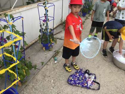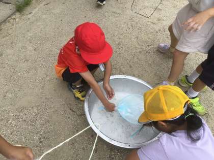 うちわやハンガーでシャボン玉作りをしました。