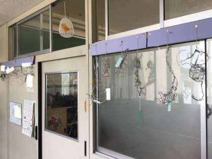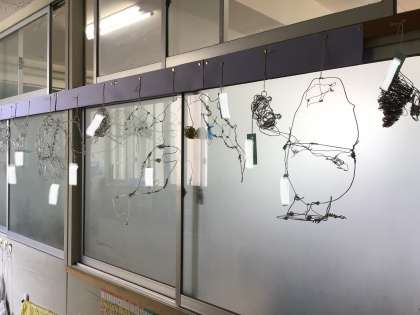 「立ち上がれ ワイヤーアート」の学習で作った作品を廊下に展示しました。