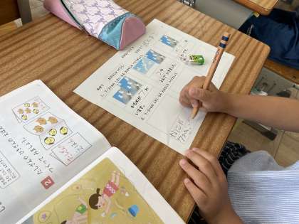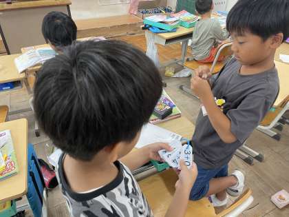 百玉そろばんで数の構成をすらすらと言えるようになりました。 また、計算カードを使って、足し算の練習をしています。
